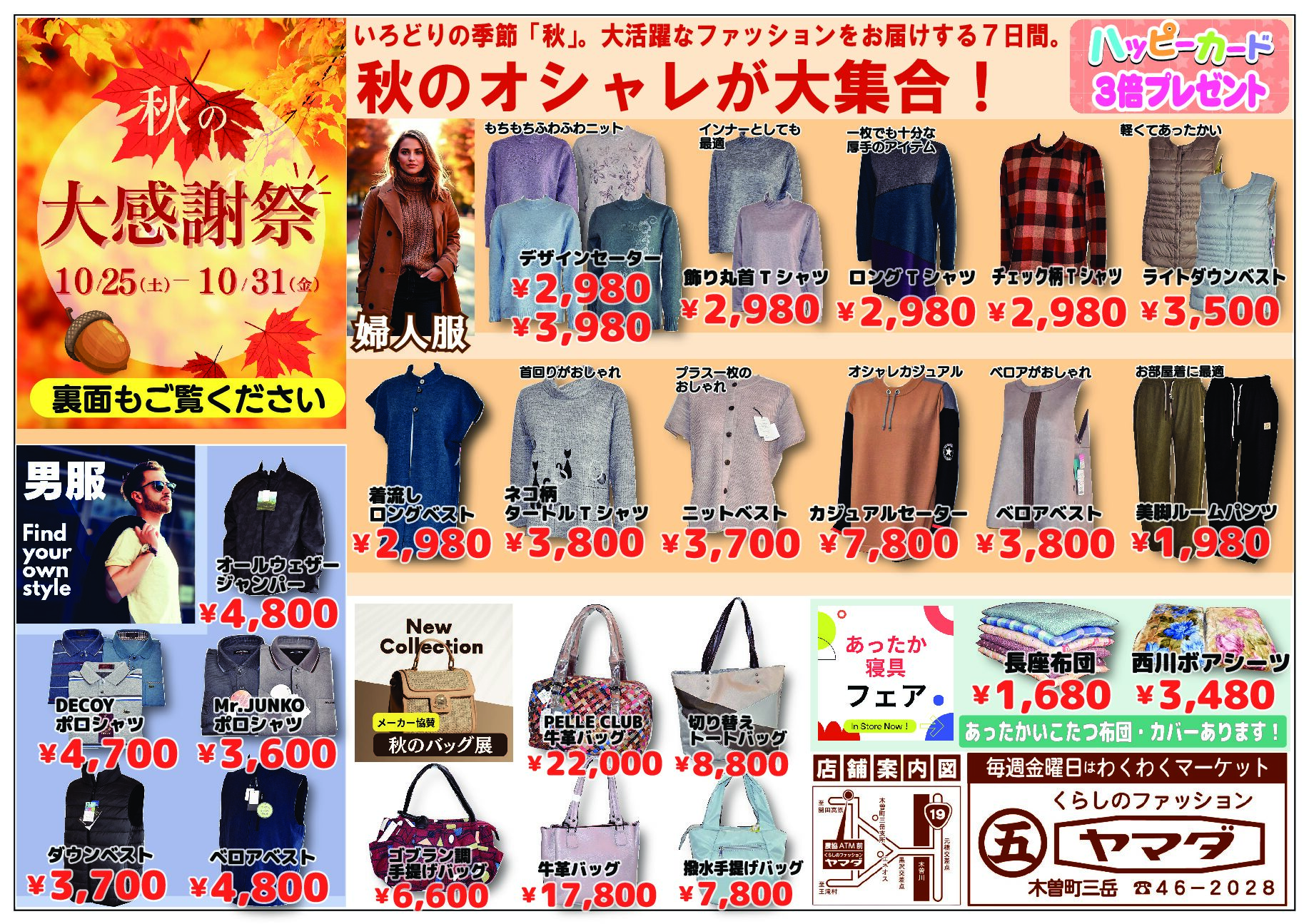 おしらせ NEW!秋の大感謝祭のおしらせ 開催期間:10月25日(土)~31日(金)秋物新作をお買い得に開催します。メーカー協賛のバッグ即売会も同時開催。ハッピーカードは現金、電子マネーとも3倍プレゼントいたします。ぜひ、ご来店おまちしております。↓ デジタルチラシはこちら ↓ 2025.10.25 おしらせ